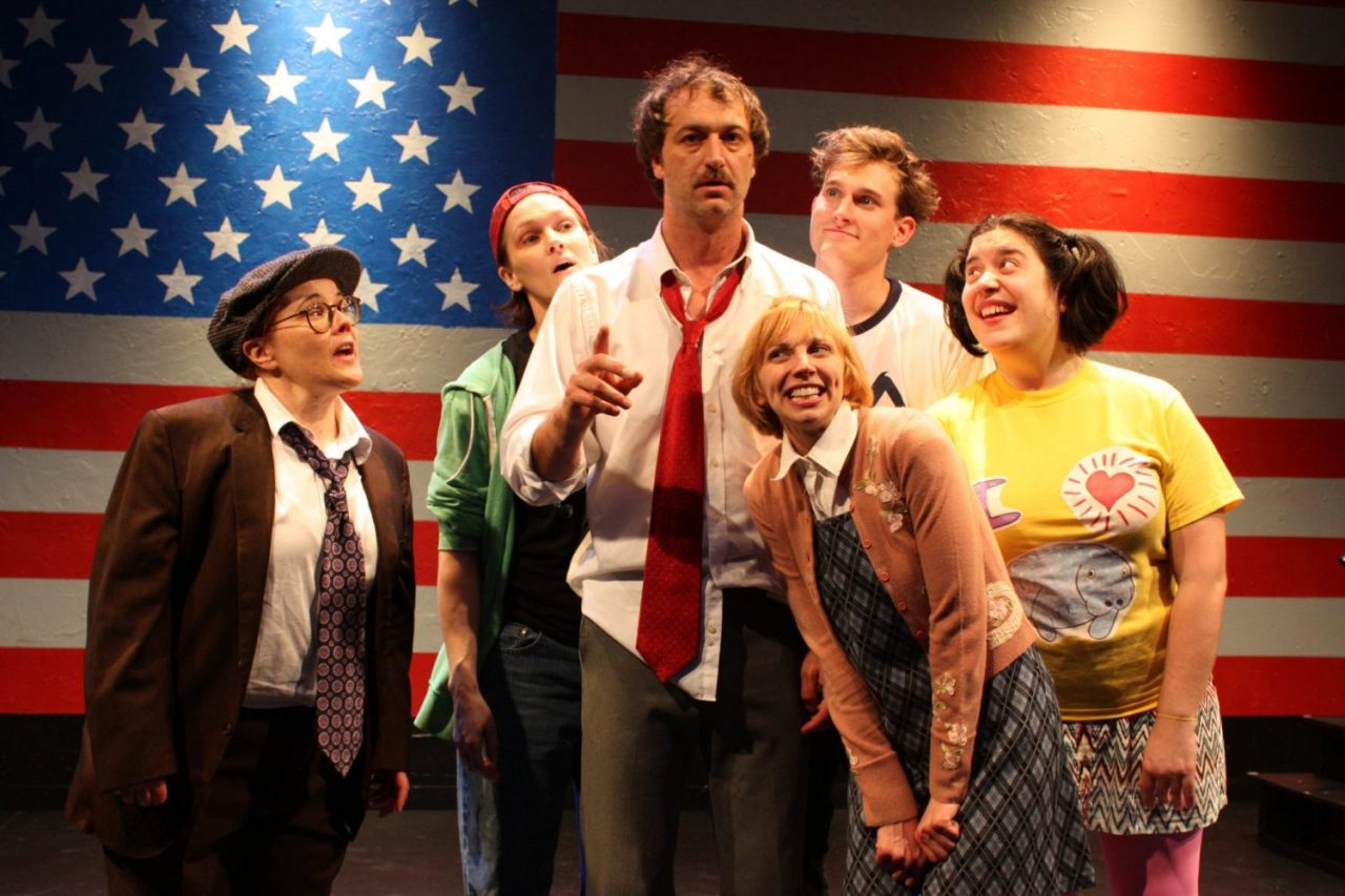 The students of William Jennings Bryan Elementary are threatened by the fundamentalist Christian leanings of their Principal, Dr. Godfrey Marsden (a wonderfully twisted and downright gross Tom Chace) who has just thrown his hat in the ring for a gubernatorial run. As we learn, even in the lobby, “Dr. God” has more than influenced the curriculum with Biblically themed lunches, levels of detention and offerings such as “One plus One plus One = 1: Algebra and the Holy Trinity.” The 3rd graders, led by the class cool kid, Derek (Gamm company member Karen Carpenter) decide to enlist the help of hippy-dippy drama teacher Ms. Lopiccolo (a spaced-out, yet deliciously fierce Melissa Penick) and stage a subversive musical in front of the school, the parents and the voters to counteract Dr. Godfrey’s Tea Party dogma.
