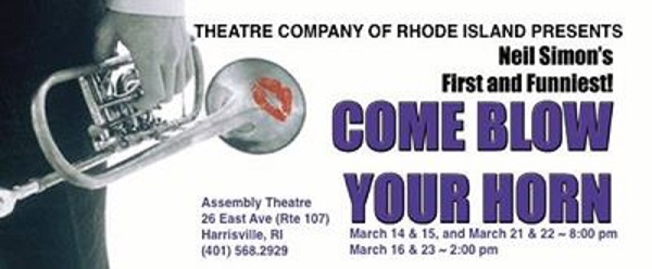 Come Blow Your Horn continues at the Assembly Theater in Harrisville (Burrillville) on Friday and Saturday, March 21 and 22 at 8pm and at 2pm on Sunday, March 23. For tickets, call the box office at 401-568-2929. March 23 marks the 30th anniversary of the founding of Theater Company of Rhode Island.
