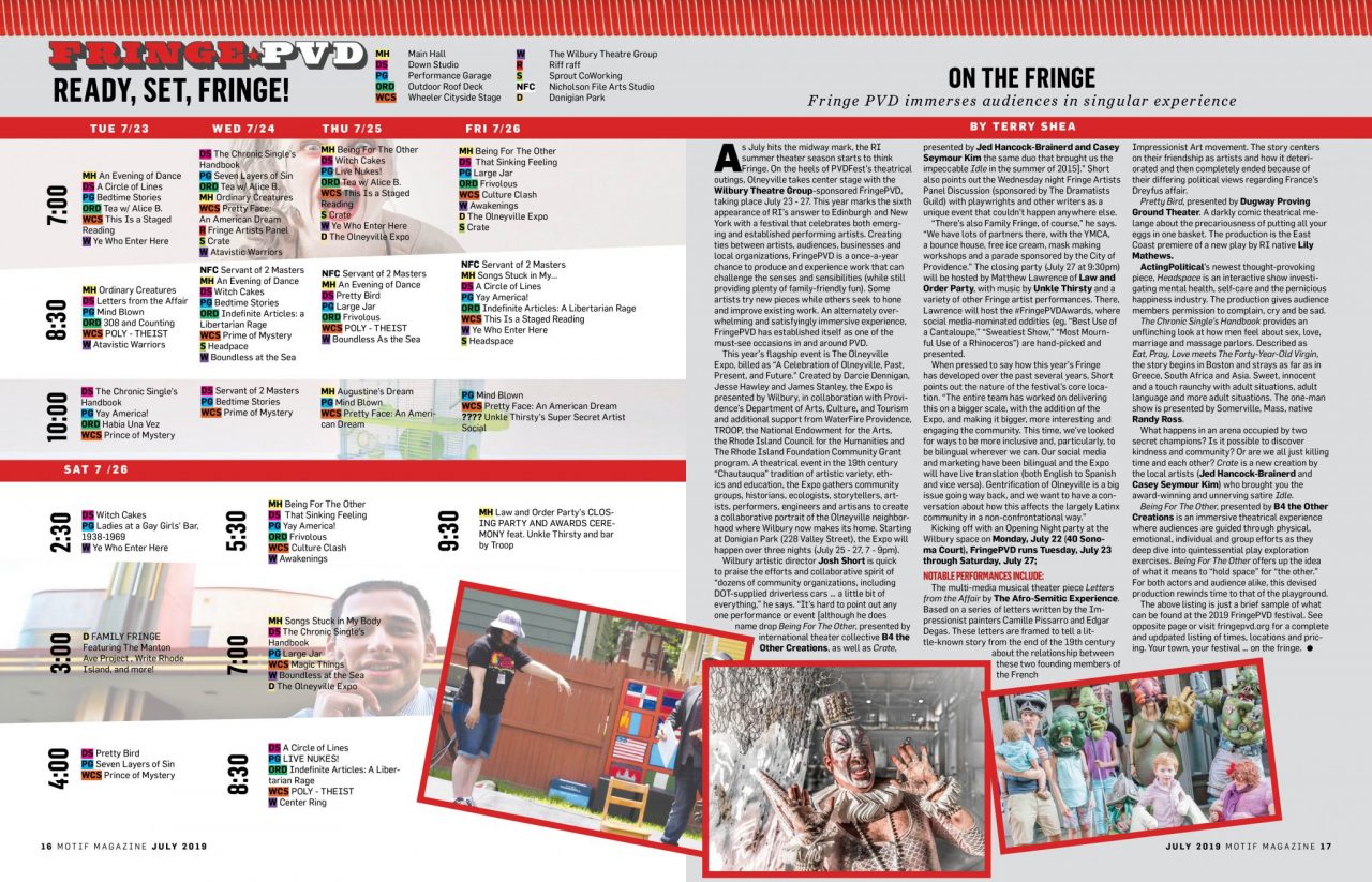 The above listing is just a brief sample of what can be found at the 2019 FringePVD festival. See opposite page or visit fringepvd.org for a complete and updpated listing of times, locations and pricing. Your town, your festival … on the fringe.