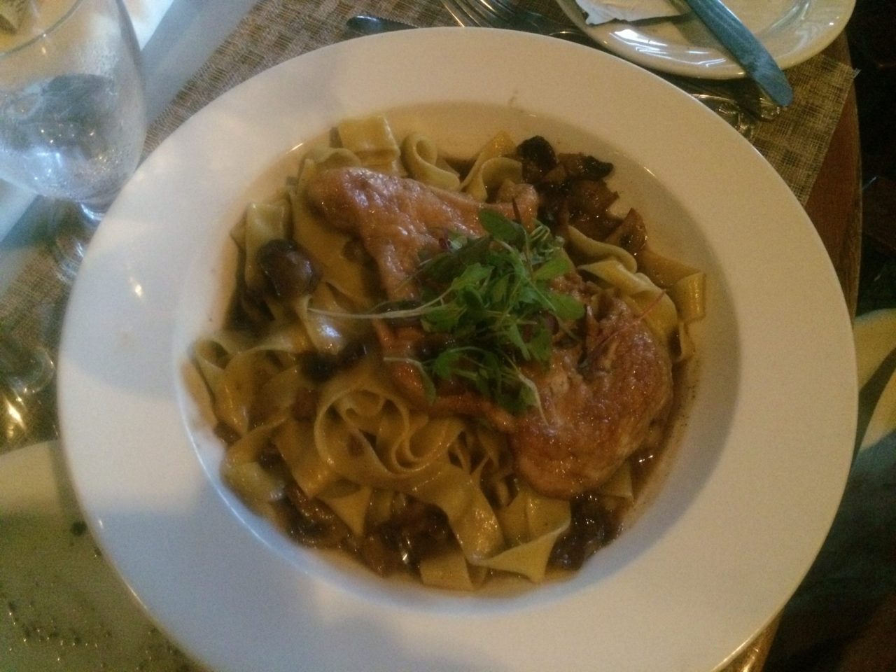 The last time we were there for dinner we took along several of our friends to sample the restaurant’s generous portions. One of our friends is doing his own worldwide taste testing of chicken Marsala. Every time we go out for dinner that is what he orders, and he gave 19th Hole’s rave reviews. My other friend ordered salmon. She is very conscious of her diet and usually eats only half of her dinner, but this time, she cleaned her plate and was the first one finished. Another friend and I had the frutta de mare with lobster, shrimp, scallops and clams. It is served in a spicy red sauce over pappardelle pasta, which is made fresh in house. My only issue with the frutta di mare was that they leave the shells on the shrimp, making it a little messy to eat.