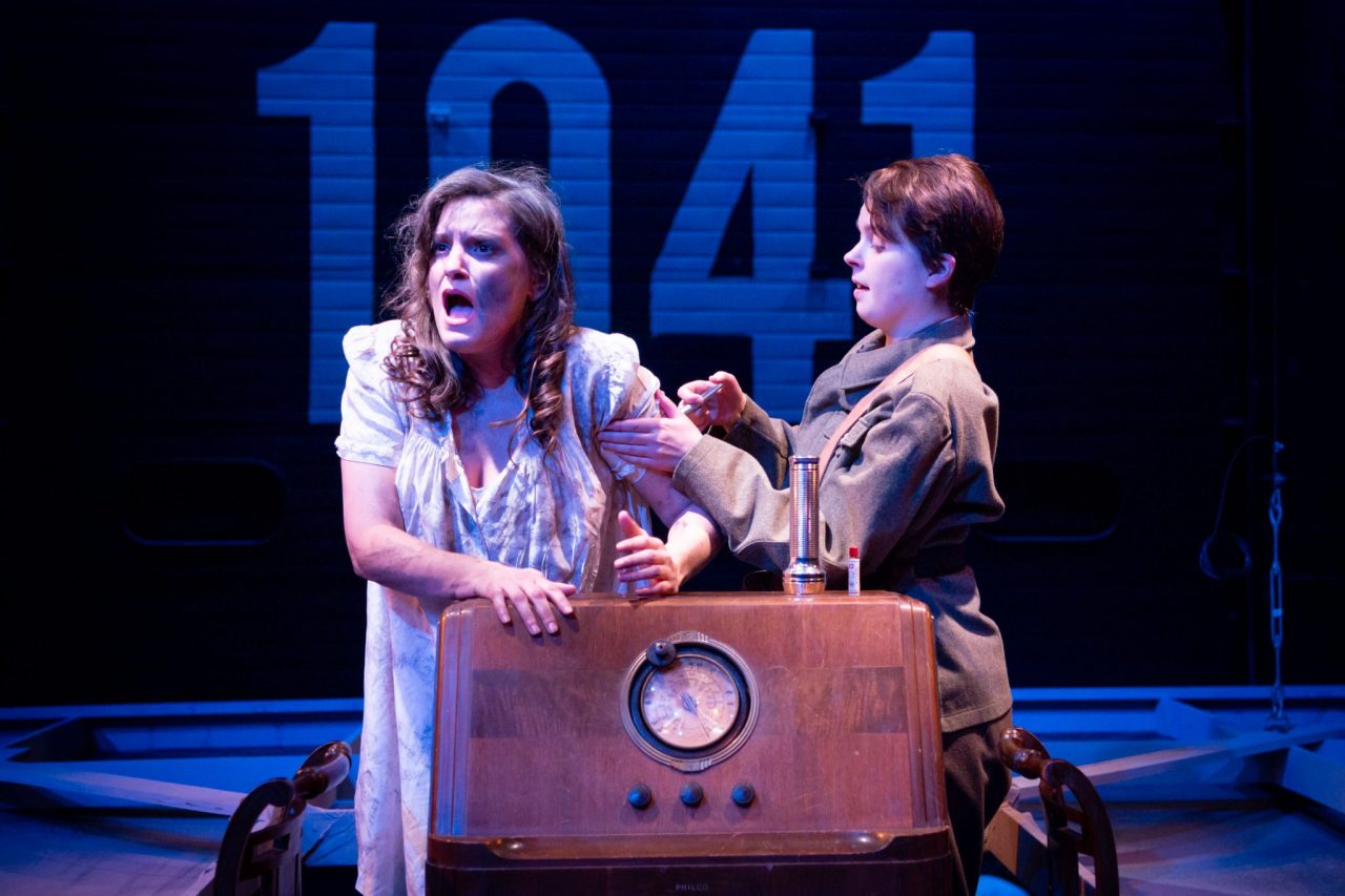 The Night Watch at Gamm is a good story well told, fun to watch with a spare set – credited to Michael McGarty – consisting mostly of scaffolding, banners, and a period floor-standing cabinet radio that eventually “plays” 1940s classics ranging from “We’ll Meet Again” by Vera Lynn to “Der Fuehrer’s Face” by Spike Jones and his City Slickers. The British accents are unusually on point – Candice Brown is credited as dialect coach – careful to reflect the background and social class of the speaker, from implicitly posh Robert to nearly Cockney Mickey. The costumes are faithful and detailed – credited to Meg Donnelly – down to the painted letter “A” on the helmets of Kay and Mickey; the British, in typical no-nonsense fashion, used “A” for “ambulance,” “R” for “rescue,” “W” for “warden,” “F” for “fireman,” and so on. The dramaturgy article in the program by URI Lecturer Rachel Walshe is well worth reading.