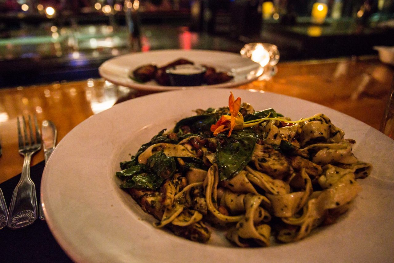 pestoLocal bands play every Wednesday. On the night I visited, Dynamite Shack began their set just as I was introduced to the Chicken Pesto, tossed with a housemade al dente fettuccine. Unlike most other pestos, pureed into a green slime, Norey’s has pine nuts that pop in your mouth followed by a slight crunch. The tomato and spinach brighten the dish nicely while also keeping it from falling down a hole too rich to escape from.