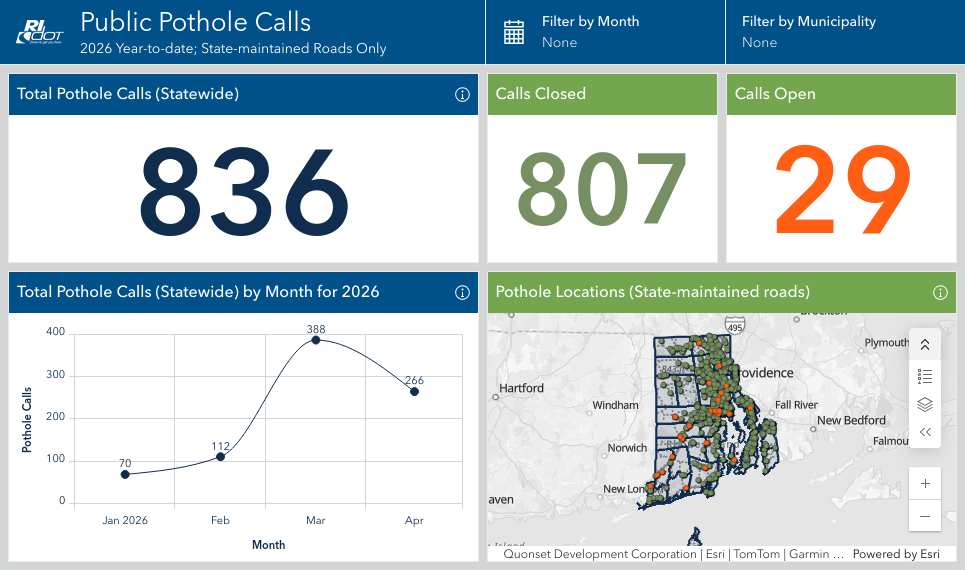 The RI Department of Transportation (RIDOT) announced a major initiative to repair potholes caused by a harsh winter. A new Pothole Service Requests Dashboard site on the web – https://www.dot.ri.gov/travel/potholes.php – allows the public to report locations needing repair, and monitor progress. It includes overall counts and a map that can zoom down to individual reports, showing completed repairs in green and outstanding reports in red, with updates every three hours. Reports can also be made by phone by dialing 5-1-1, answered by live operators 24 x 7.