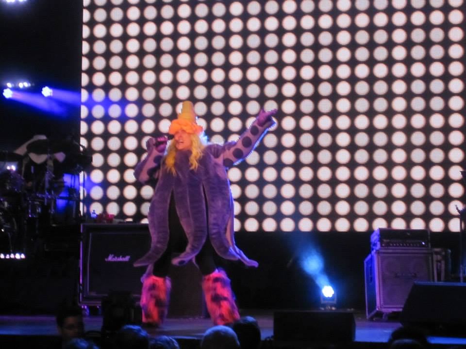 gagayankFrom there he went into more Mandatory Fun with “Lame Claim to Fame.” Al asked, “Are you ready to Polka?” and then donned his accordion and plunged into his Polka medley, “Now that’s what I call Polka!” This consisted of bits from ”Too Fat Polka,” “Wrecking Ball,” “Pumped Up Kicks,” “Best Song Ever,” “Gangnam Style,” “Call Me Maybe,” “Somebody That I Used to Know,” “Sexy,” “Get Lucky” and more. Between songs the video screen kept the audience amused with clips of references to Weird Al in popular culture from the news, sitcoms and movies. Many celebs were included in these clips: Bill Maher, Mary Steenburgen, Celine Dion, Alex Trebek and more. There were also segments that appeared to have been produced for the concert. These were just as entertaining as the show! This gave Al and the band a few minutes to make the MANY costume changes throughout the night. He spoofed Lady Gaga with “Perform This Way” dressed in a furry octopus jacket and a large ice cream cone “smooshed” on his head. “Dare to be Stupid” (one of my fav’s) brought out the flower pot hats and yellow jumpsuits as he channeled his inner DEVO. He changed into a “fat suit” for his Michael Jackson spoof, “Fat.” “Foil,” a parody of “Royals” by Lorde had Weird Al wearing an aluminum foil hat, thus explaining the aforementioned tin foil hats. “Smells Like Nirvana” brought out the cheerleaders and grunge. Another medley followed with “Party in the CIA,” “It’s All About the Pentiums,” “Handy,” “Bedrock Anthem,” “Another One Rides the Bus,” “Ode to a Superhero,” “Gump,” “Inactive,” “eBay” and ended with “Canadian Idiot” and an explosion of red and white streamers.