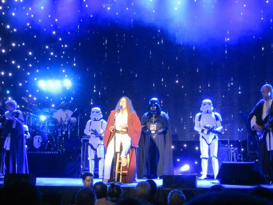 swyankThe signature suited garb and long beards of the Amish and “Amish Paradise” closed the set. He emulated a James Brown ending by having a silver cape thrown over his shoulders. “Want some more?” he screamed, “I can’t do no more!…I just got done explaining that to you!” and Al was led offstage. Thunderous applause and a standing “O” brought the keyboard player out in a dark, hooded robe. Stars lit the background of the stage. The cloaked figure went into “Phantom of the Opera” organ music. A satire song of a mock interview with Michael Stipe of REM was the basis for the first bit of the encore. “We all have cell phones so come on get real,” was assisted by audience vocals. Stormtroopers and Darth Vader entered. A light saber waved in the crowd. “The Saga Begins,” Al’s epic, mock “American Pie” got the fans singing more. The stormtroopers, decked out in their white plastic armor, were grooving to the music. The apropos follow-up piece, “Yoda,” sung to the Kinks’ “Lola” and interplayed with a bit of a capella “boom-lacka-lacka-boom” and “Frere Jaques” was the final ditty of the night.