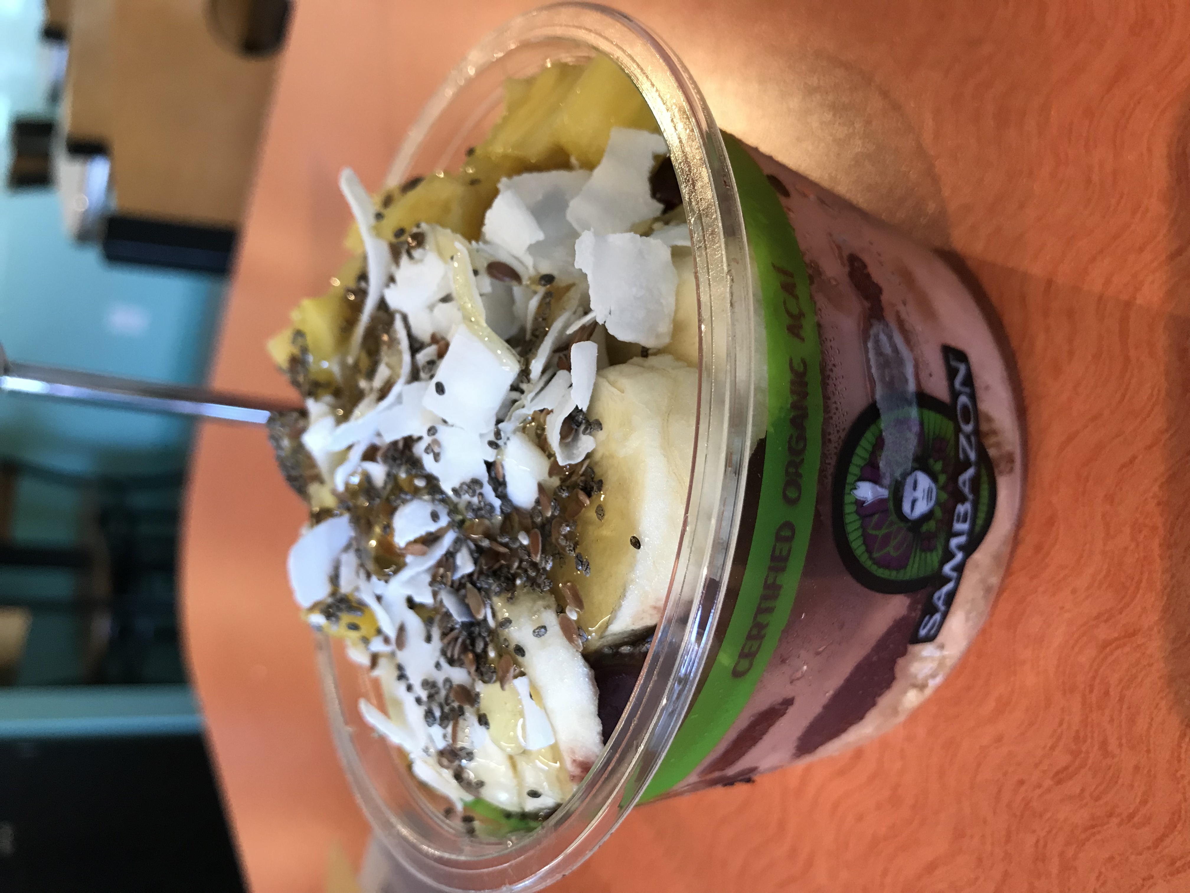 Personal note: I asked that bowls be made with almond substitutes, when applicable, due to an allergy. Orders were placed “for here,” and for this reason, I include the type of bowl given: plastic, biodegradable, ceramic, etc, both for environmental reasons and for ease of eating.