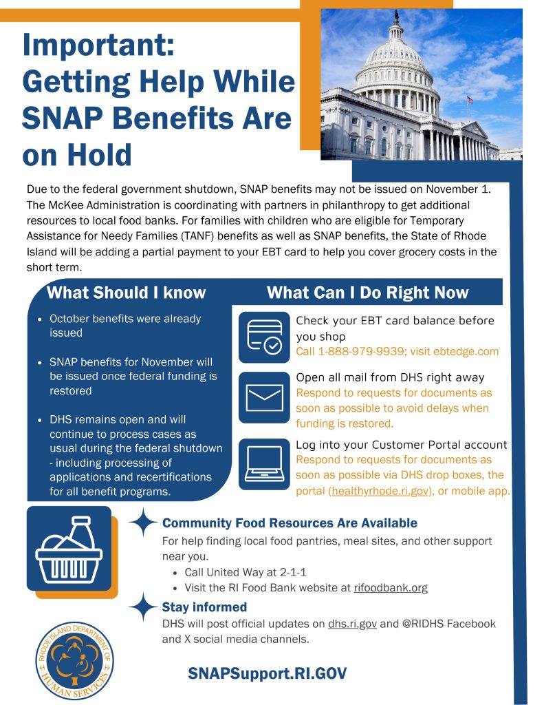 The state government created a special web page to keep the public informed during the emergency: SNAPsupport.ri.gov. United Way of RI operates its telephone help center 24×7, 365 days of the year, supporting more than 200 languages, reachable by dialing 2-1-1. United Way is also enhancing accessibility for in-person consultations at its 50 Valley Street headquarters in Providence.