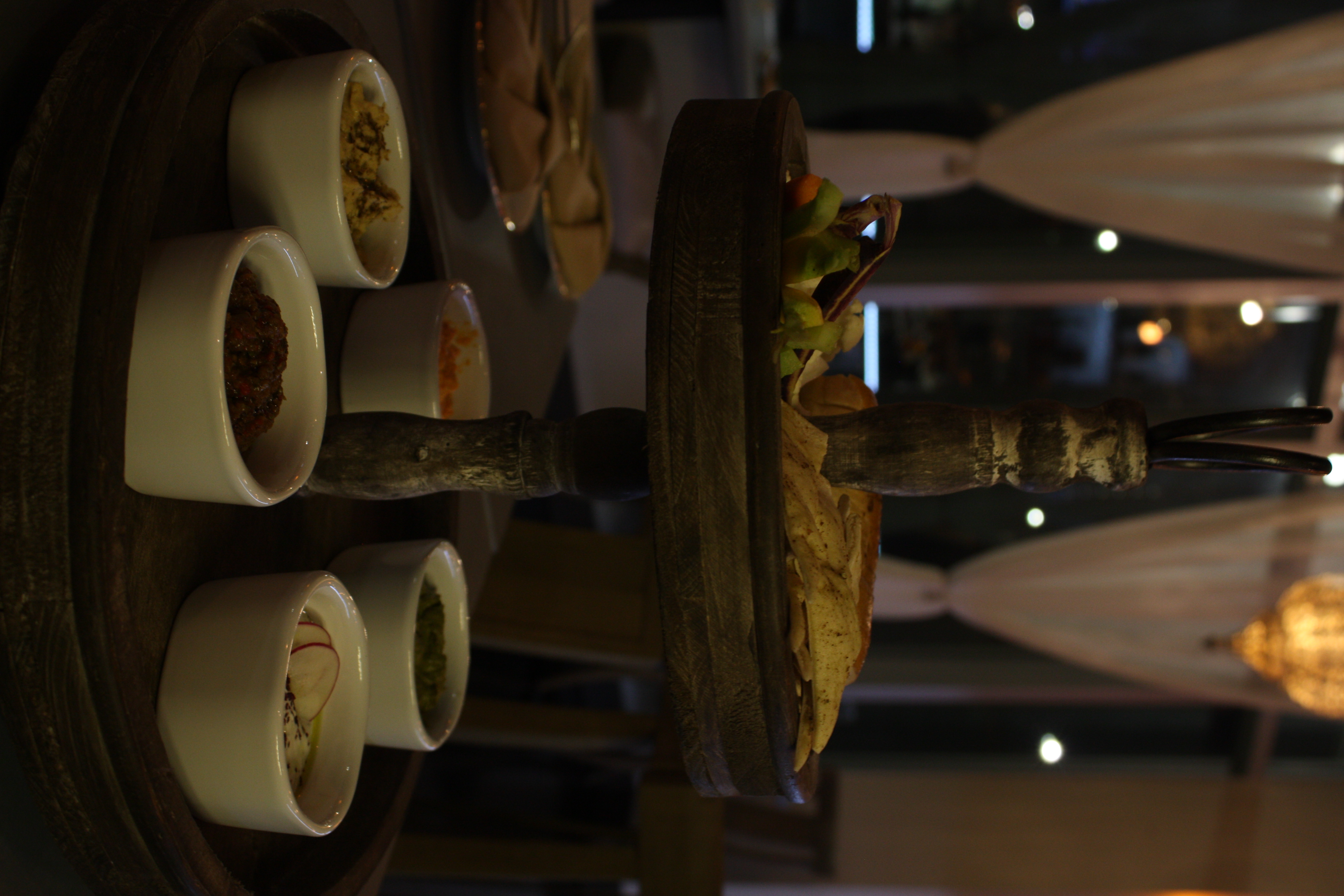 The mezze plate was the first to arrive — with all five dips — and it came out in a tiered tower, reminding me of a display I saw in an Egyptian coffee shop. Hummus, fire-roasted eggplant, green tahini (made with fresh parsley), spicy feta and labneh were served with sliced pita, French baguette and colorfully assorted vegetables. “The fire-roasted eggplant is truly fire-roasted. You will taste it,” Nadirov told us, and he was right! In Turkish tradition, eggplants are completely covered by the hot embers from a wood fire, charring the skin of the eggplant and creating a truly smoky finish. This was the first sensation to hit the taste buds, followed by sweet notes from red peppers. And that was just the first dip we tried! The labneh might have been my favorite — a type of yogurt cheese mixed with Za’atar, shaved radish and sumac — light, tangy and refreshing. But given the fact Heather and I devoured all of the dips, it was hard to definitively name a favorite.