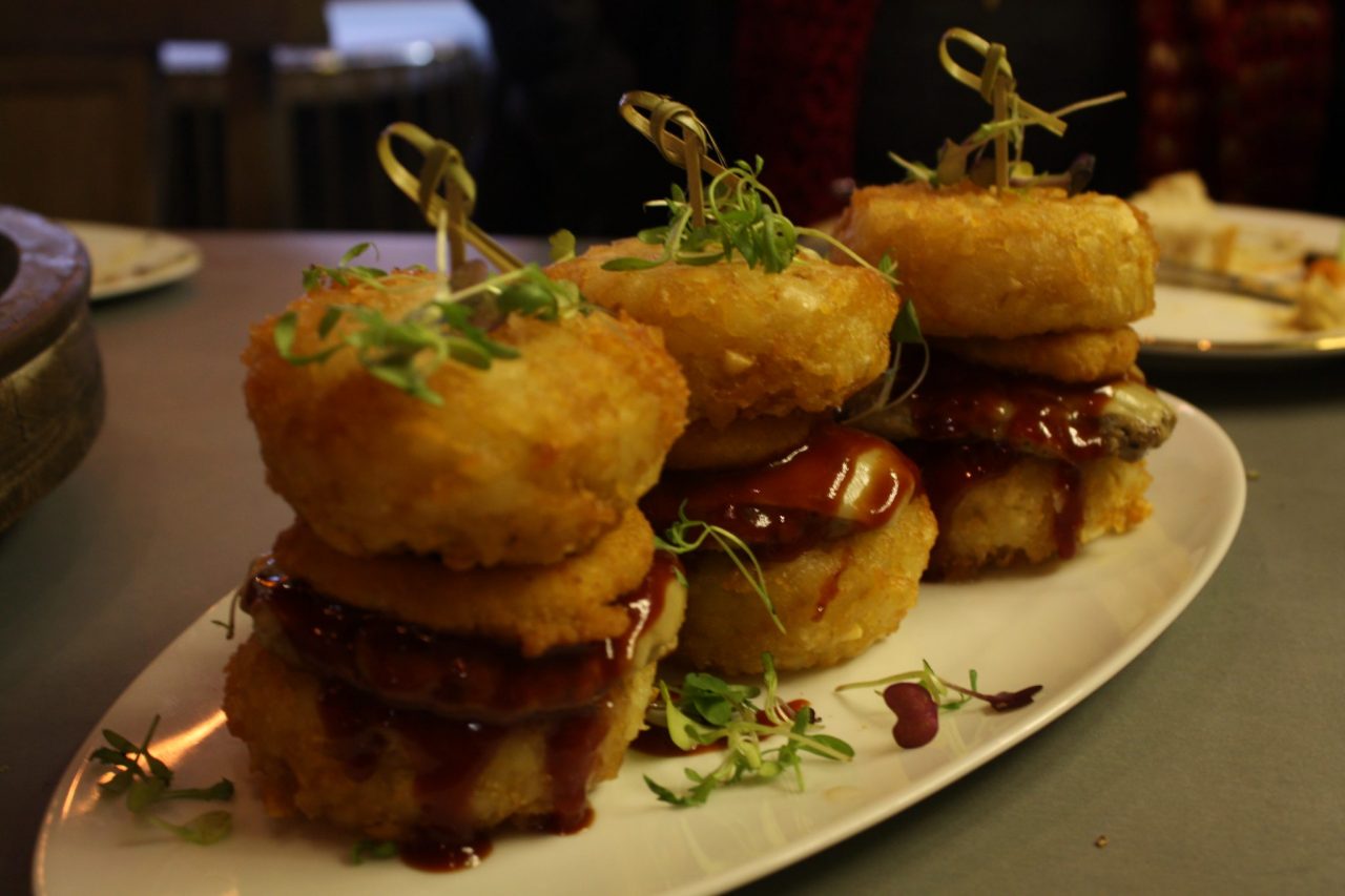 For our next dish to share, we were torn between tater-tot sliders and forbidden rice arancini, but Nick the waiter unabashedly reinforced the sliders, so we opted for this house specialty (and it’s gluten-free, as is much of their menu): a made-from-scratch tater-tot “bun,” burger meat, smoked gouda, onion rings and BBQ sauce. This, my friends, is the epitome of high-class drunk food, and I mean that kindly. Heather and I loved it, but by this point we were so full, we couldn’t finish the third slider. Our intention to order a main dish vanished along with the smoked gouda cheese and BBQ sauce.