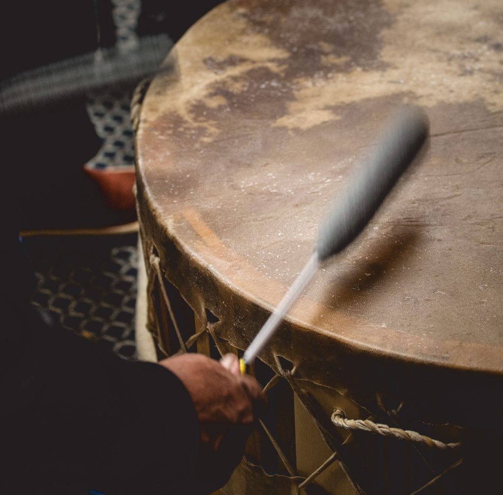 With powwow style singing, men sit around a drum, anywhere from 22 to 30 inches in diameter. The drums are typically made from deer, cow, or horse hide. “Different animal hides are used to make drums, and they kind of sound different… One of the common teachings as a singer I’ve been taught is you take care of that drum.”