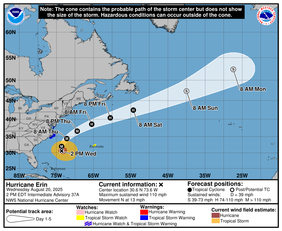 Hurricane Erin is currently at Category 2 on the Saffir-Simpson wind speed scale with maximum sustained winds of 110 MPH, and further increase in strength is likely. H. Erin briefly on Sat reached Category 5 with maximum sustained winds of 160 MPH, a significant rarity. Remember that this scale accounts only for wind speed and does not reflect other potentially deadly risks such as rainfall amounts and storm surge. H. Erin is large, with hurricane force winds extending from the center up to 105 miles and tropical storm force winds up to 265 miles.