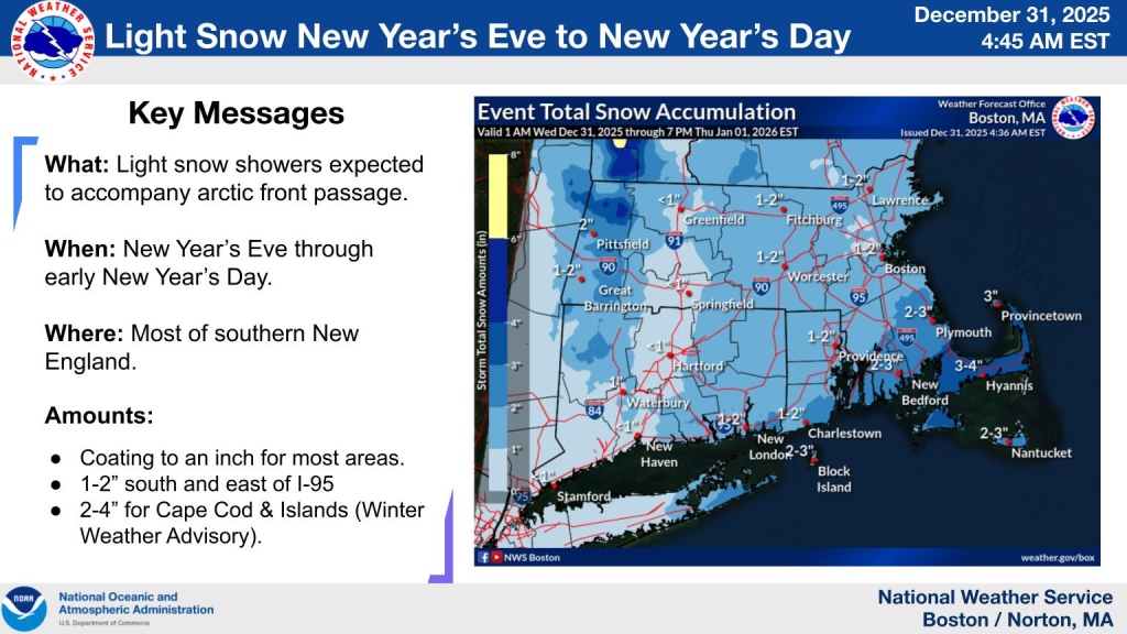 At Providence, a shortwave interacting with an arctic cold front is expected to bring 1 – 3 inches of snow Thu 12am – 7am. A Winter Weather Advisory is posted for Wed 7pm – Thu 1am.