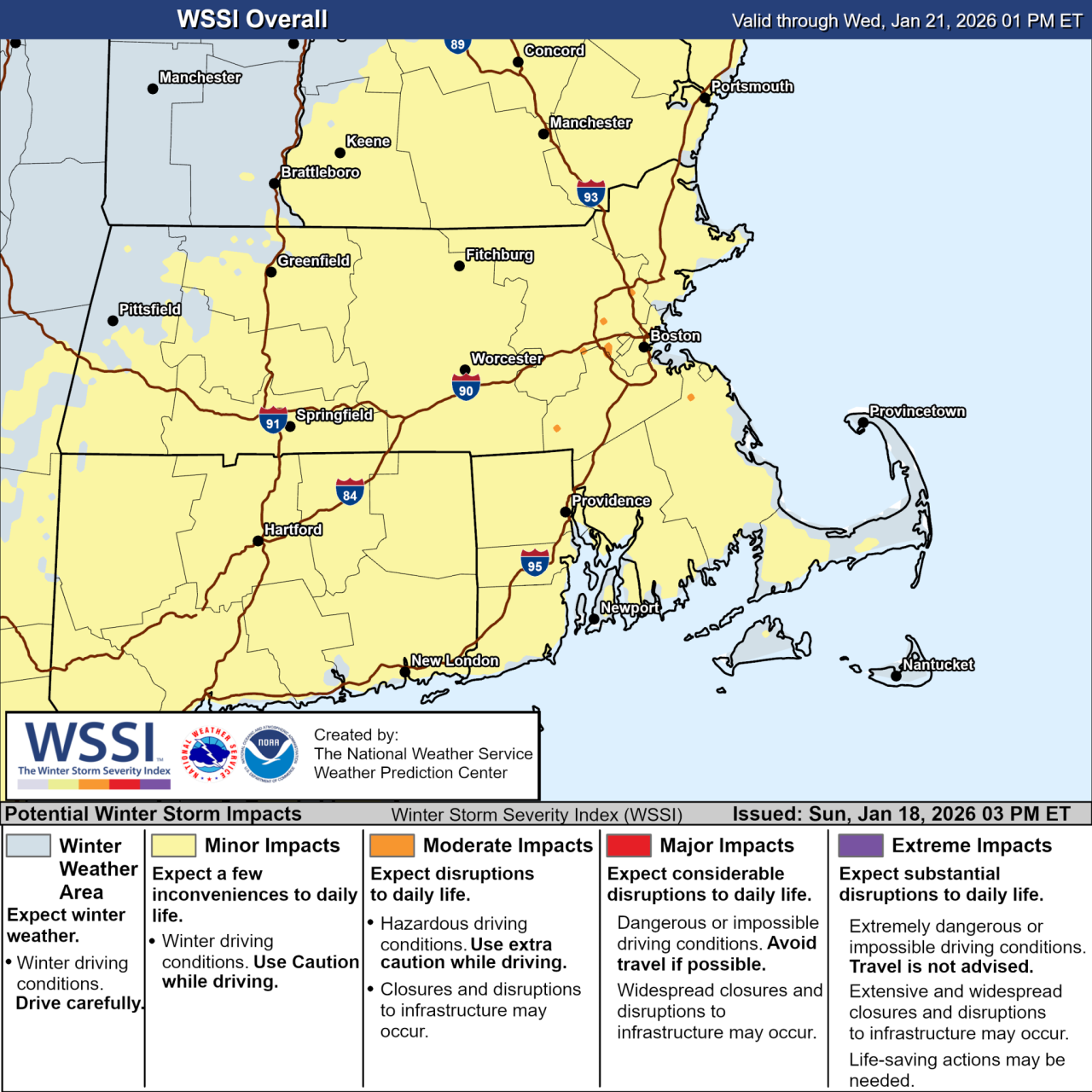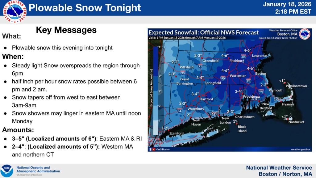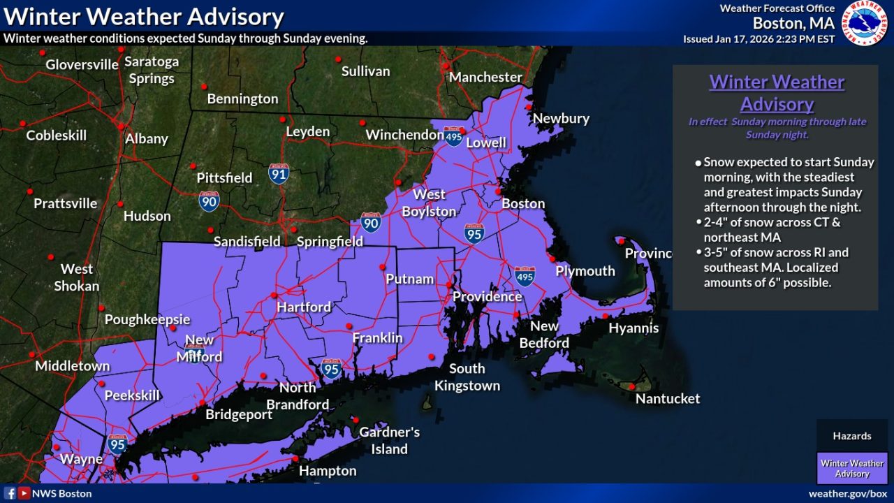 At Providence, a developing offshore coastal storm is expected to bring 2 – 4 inches of snow Sun 7am – Mon 3am, peaking Sun 5pm – Mon 1am with possible snowfall rates of 0.5 inch per hour. A Winter Weather Advisory is posted for Sun 7am – Mon 7am.