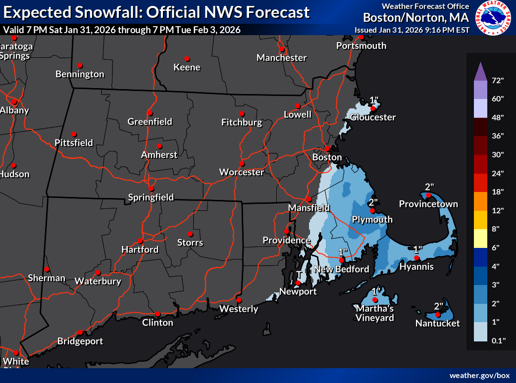 At Providence, a storm passing offshore could bring minimal snow, most likely Sun 9am – 6pm.