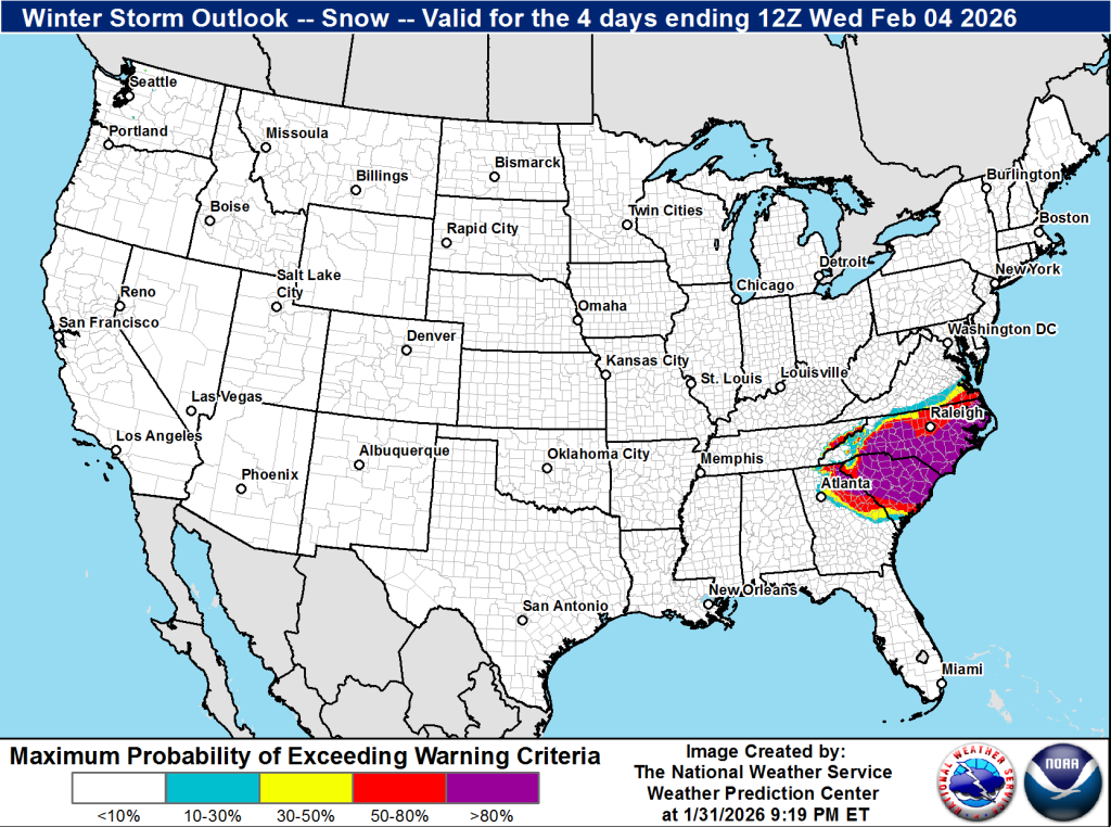 Metropolitan area probability is of at least 0.1in 56%, 1in 9%, 2in 3%, 4in near 0%. This implies a 44% probability of no snow at all.
