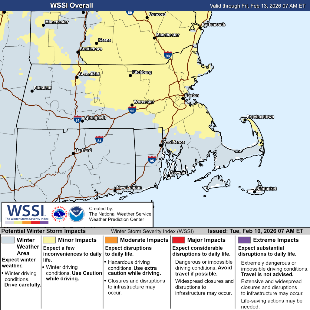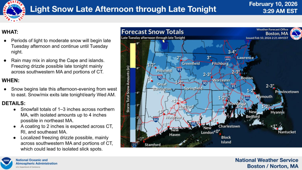 At Providence, a minor storm Tue 6pm – Wed 2am will bring under 1 inch snow. A mix with freezing rain is possible Tue 11pm – Wed 1am, making travel hazardous.
