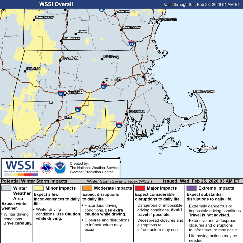 At Providence, a clipper system will likely bring snow possibly changing to rain in a first burst Wed 7am – 1pm and a second burst of all snow Thu 6pm – Fri 4am, but the chance of any precipitation at all in the second is less than 20%. Total accumulation will be under 1 inch.